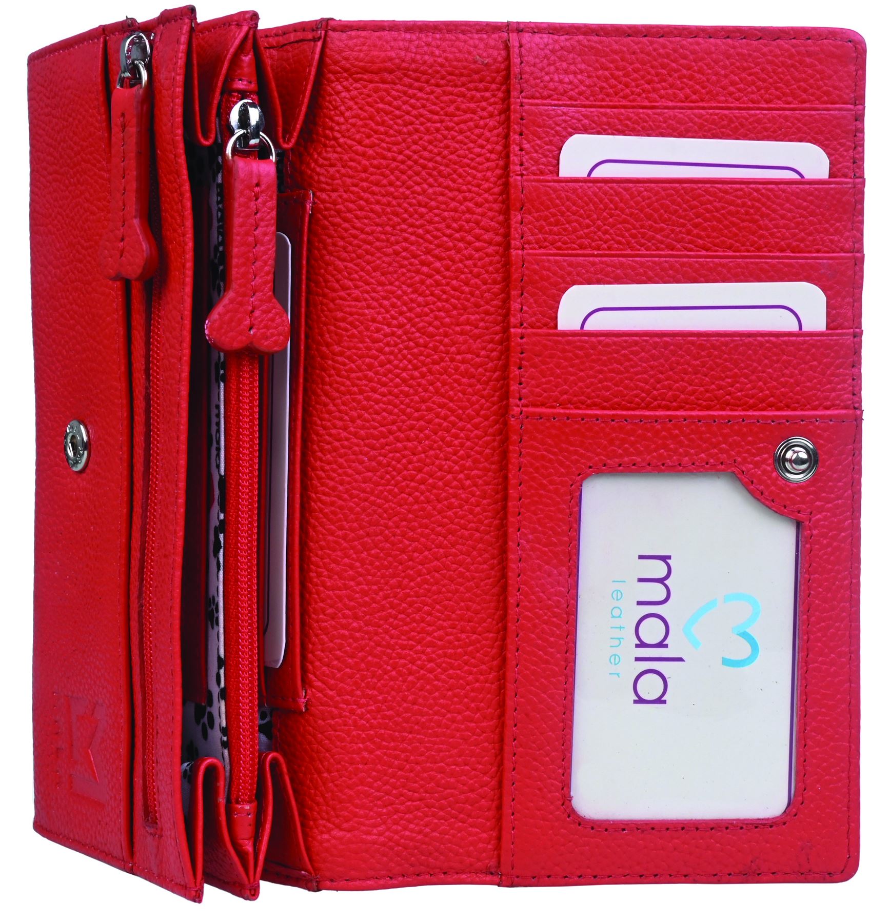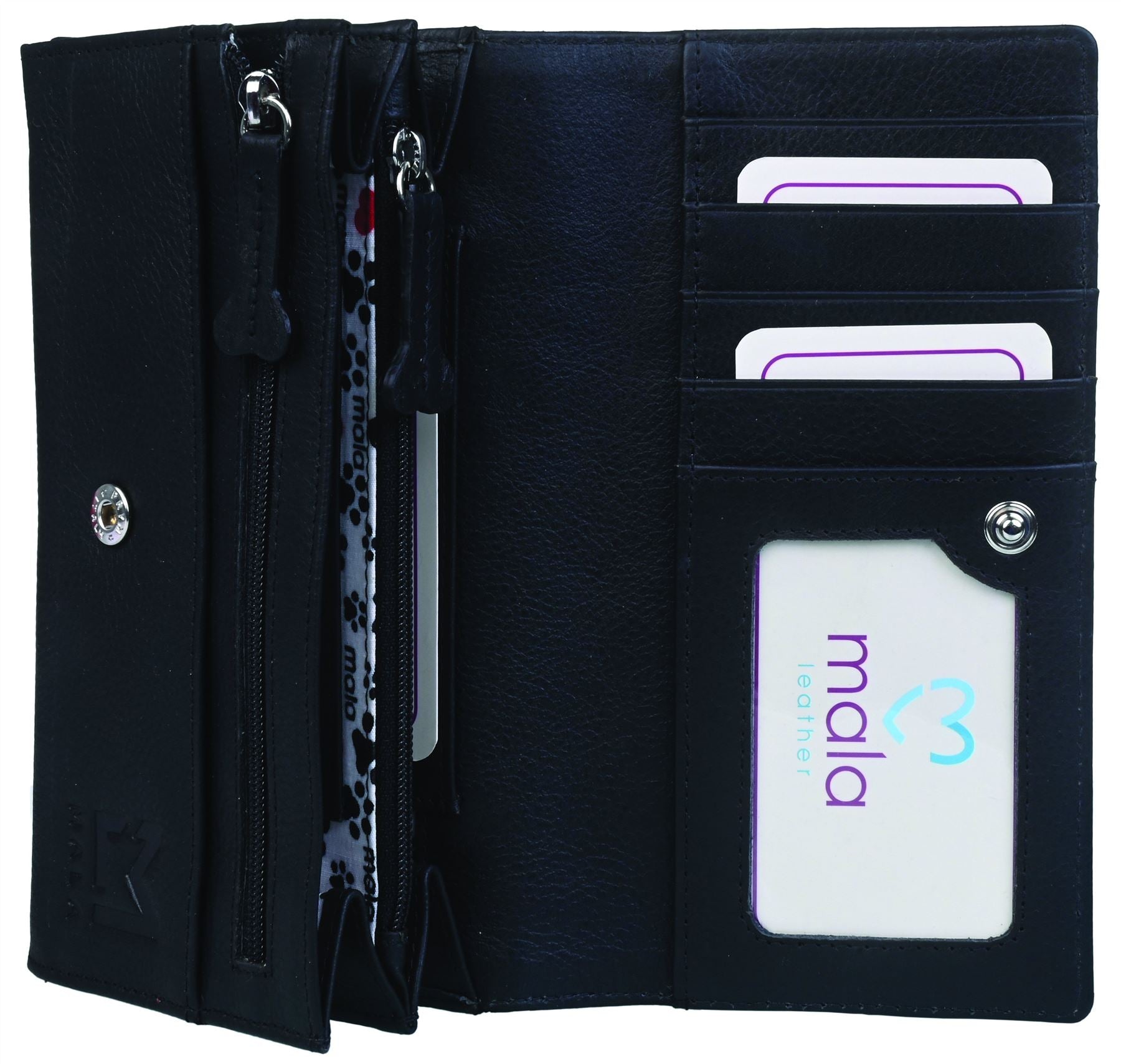 7 credit card slots, 4 banknote sized slip pockets, 2 ID / photograph windows and 2 large zipped pockets suitable for coins. Leather bone shaped zip pullers. All secured by a flap with a press stud fastener. Back slip pocket