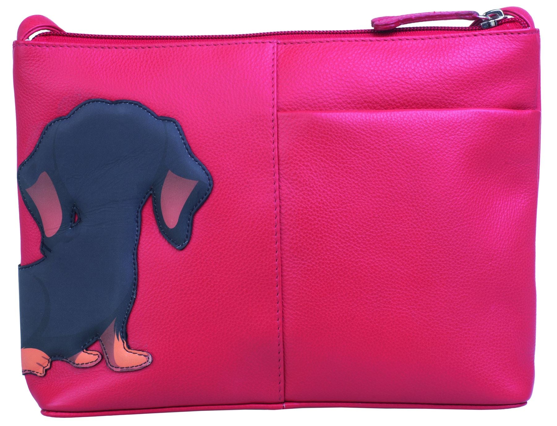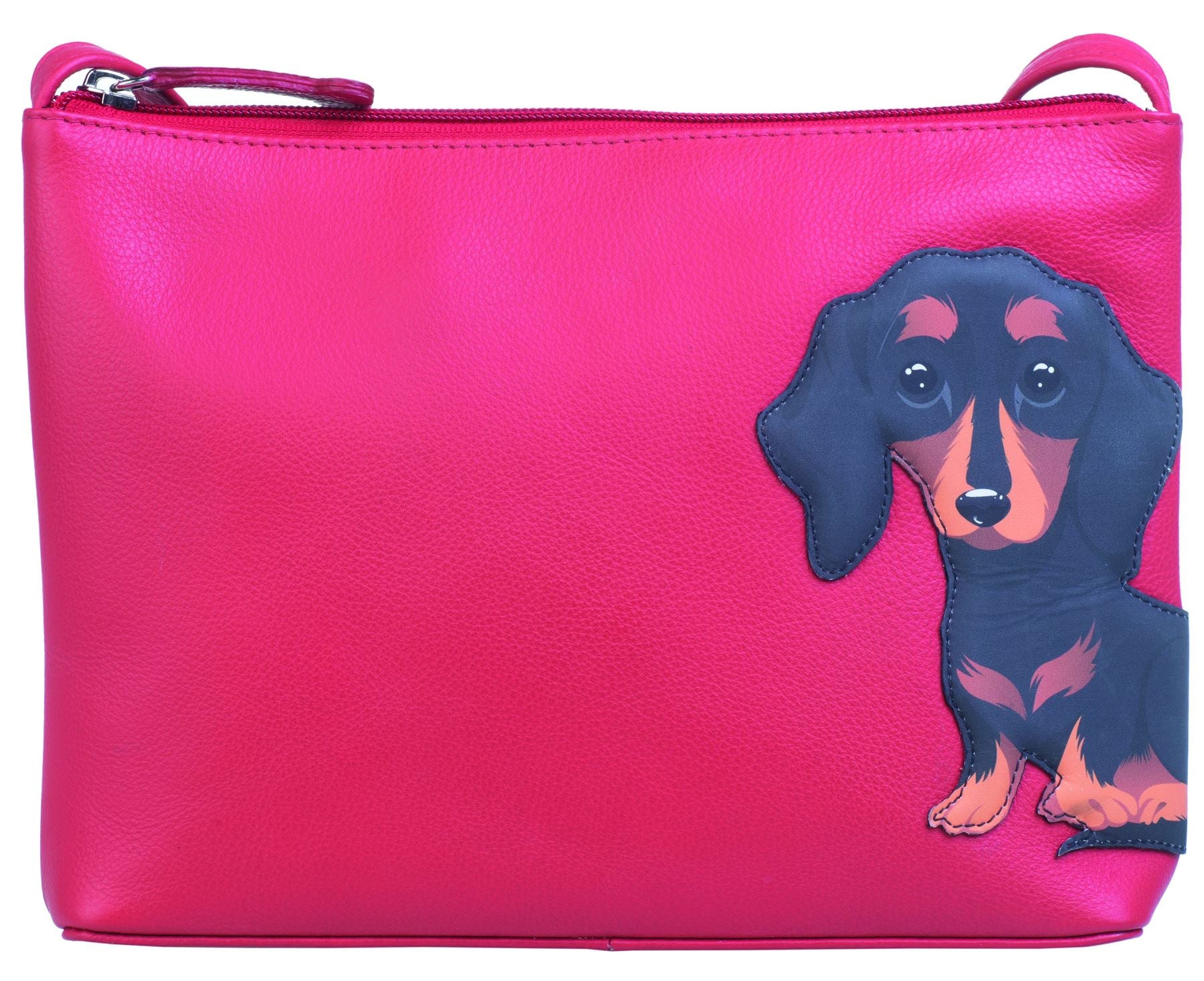 Soft supple small leather shoulder/cross body bag with applique 'Frank the dachshund' design 25cm x 18cm x 5cm