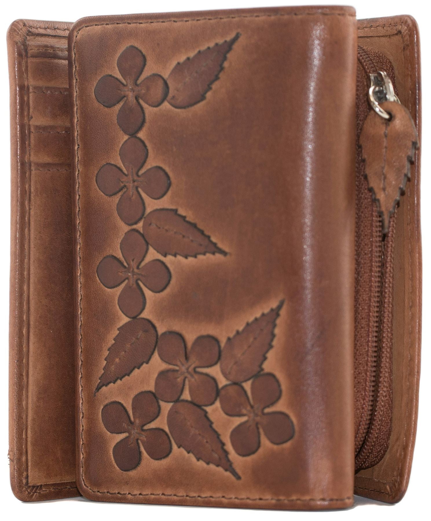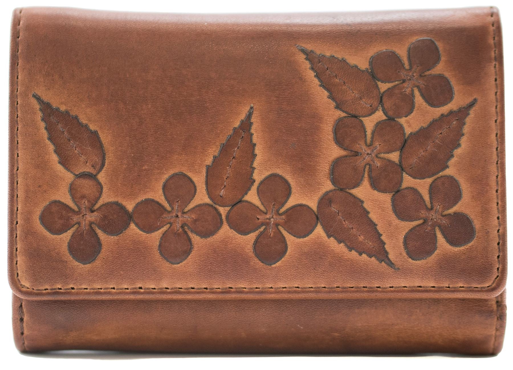 Tri-fold leather purse with decorative applique floral and leaf design 12.5cm x 9cm x 3cm.
