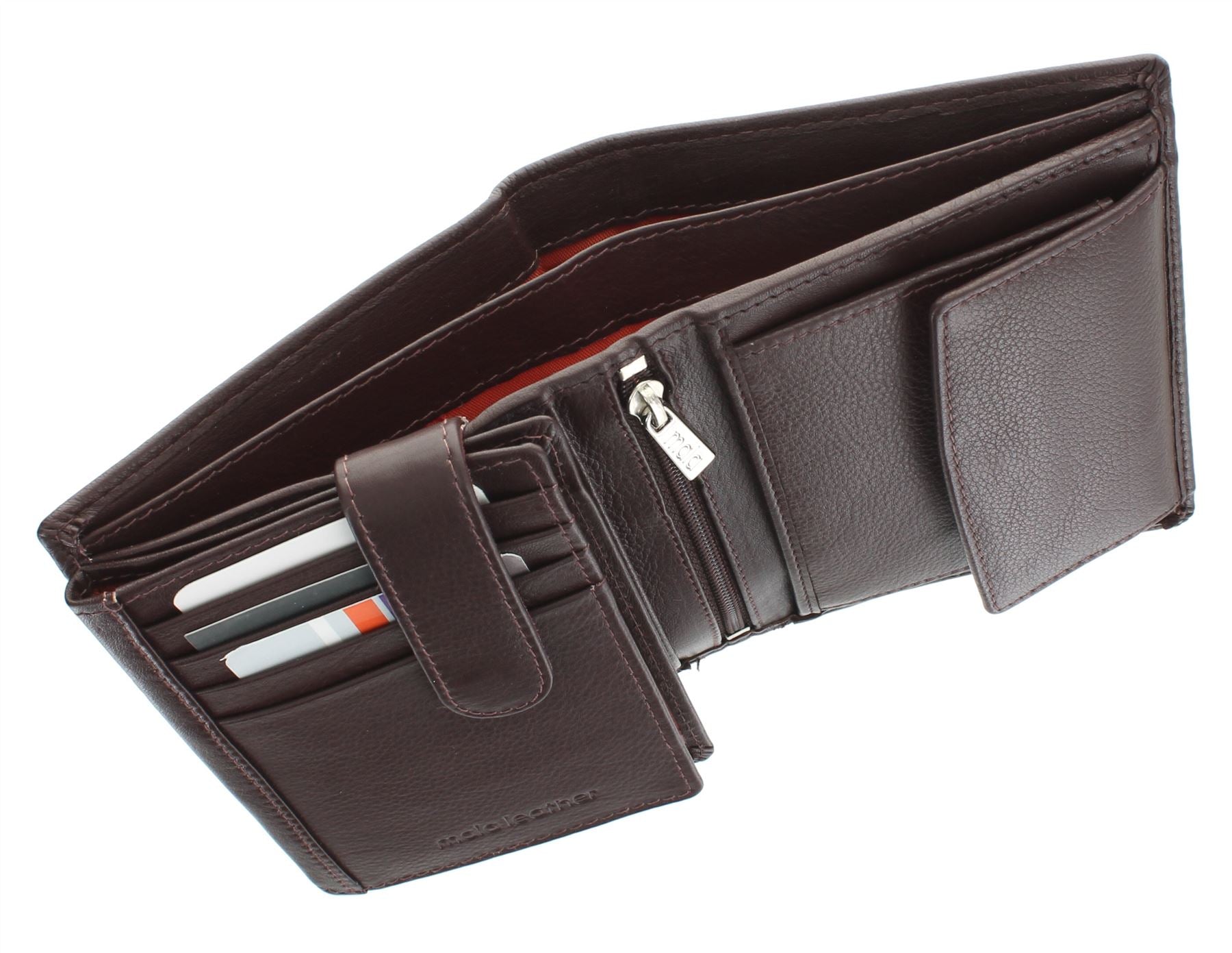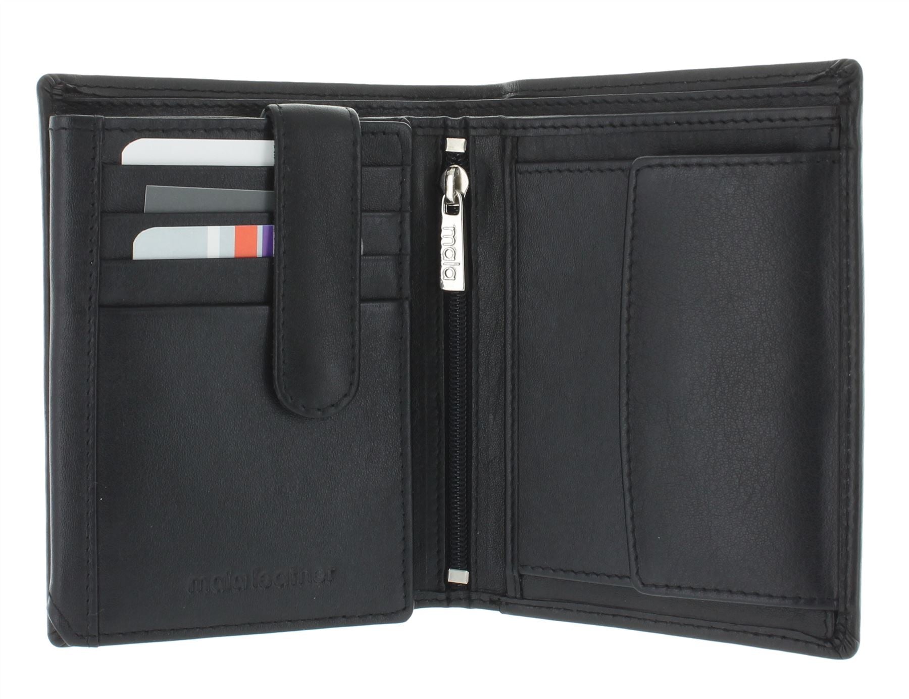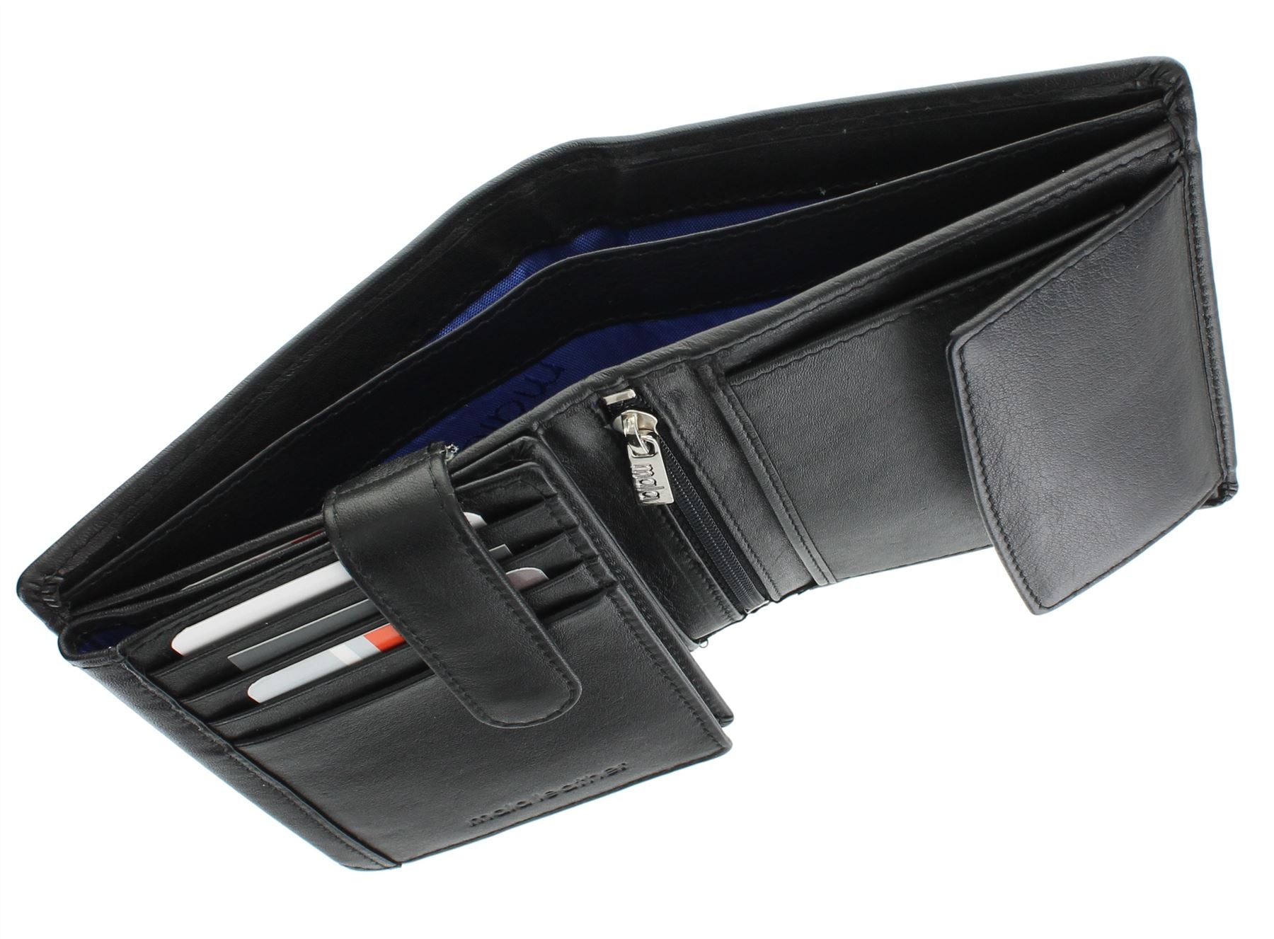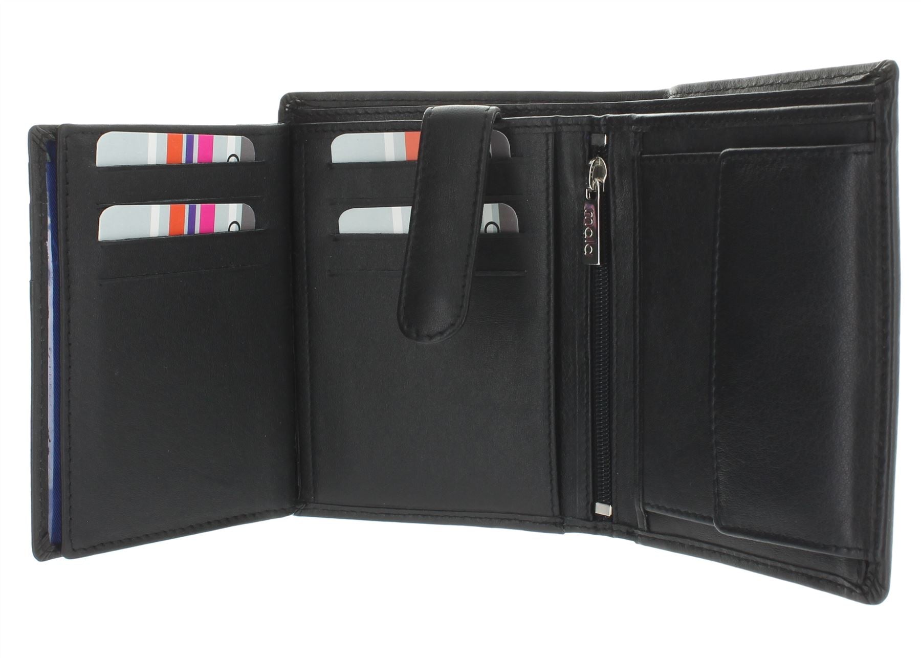 12 credit card slots and 2 ID / photograph windows. The credit card slots are secured by a leather tab with press stud fastening. 2 large, deep sections suitable for banknotes