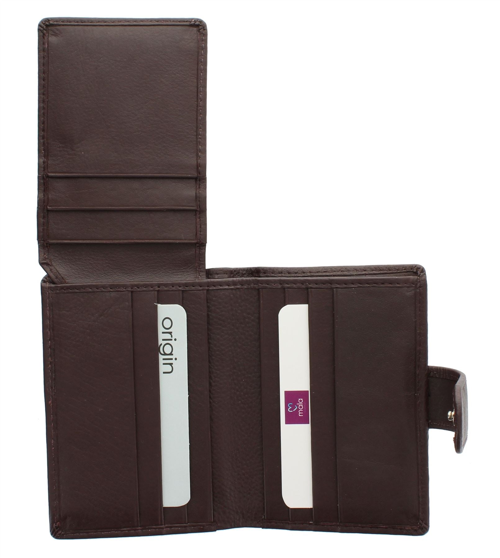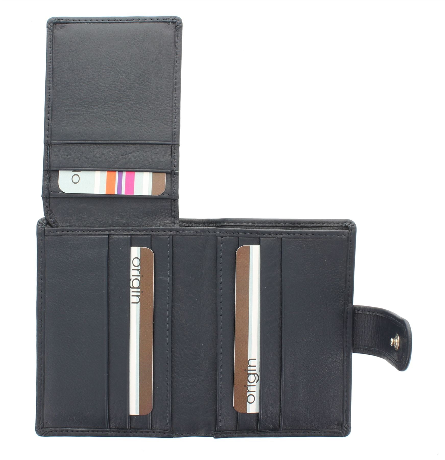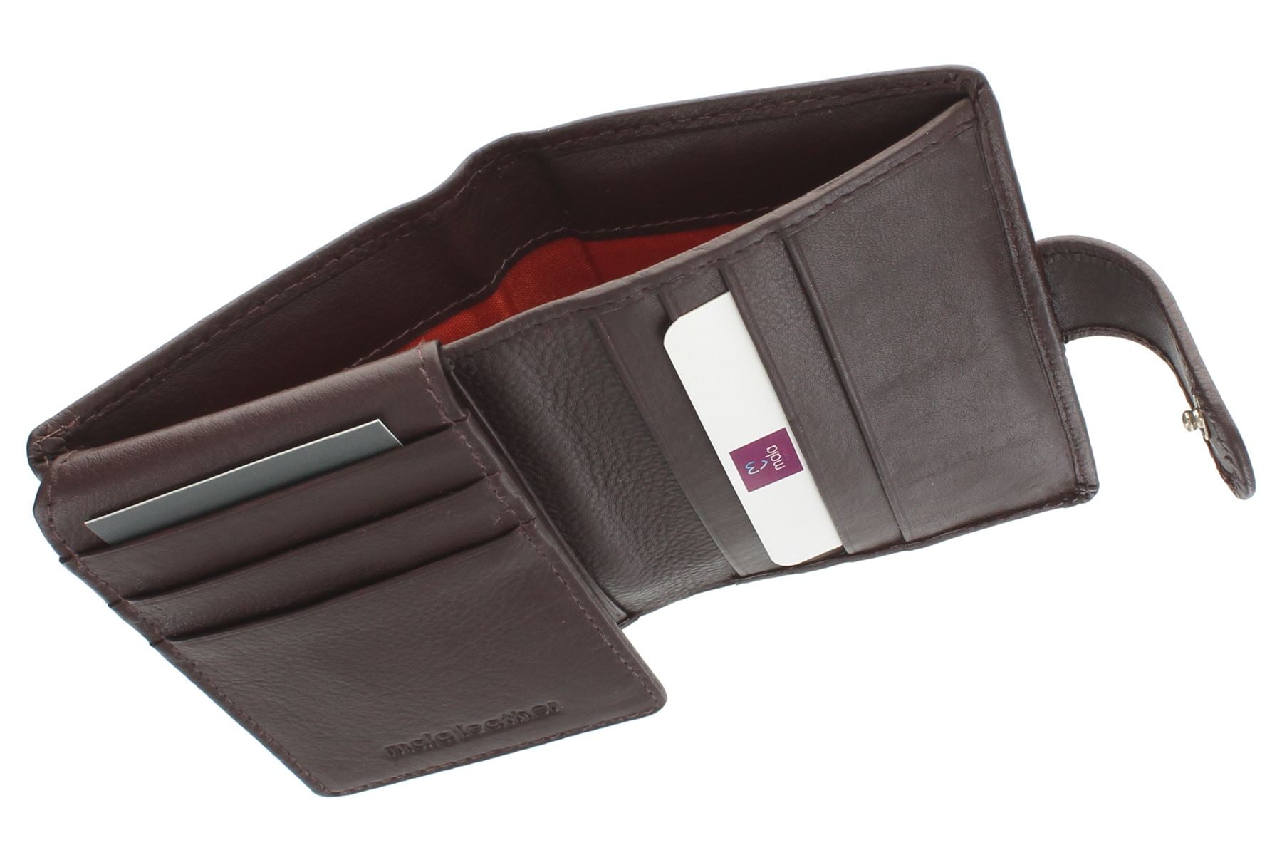 2 slip pockets for receipts / extra cards. The holder is secured by a leather tab with press stud fastening