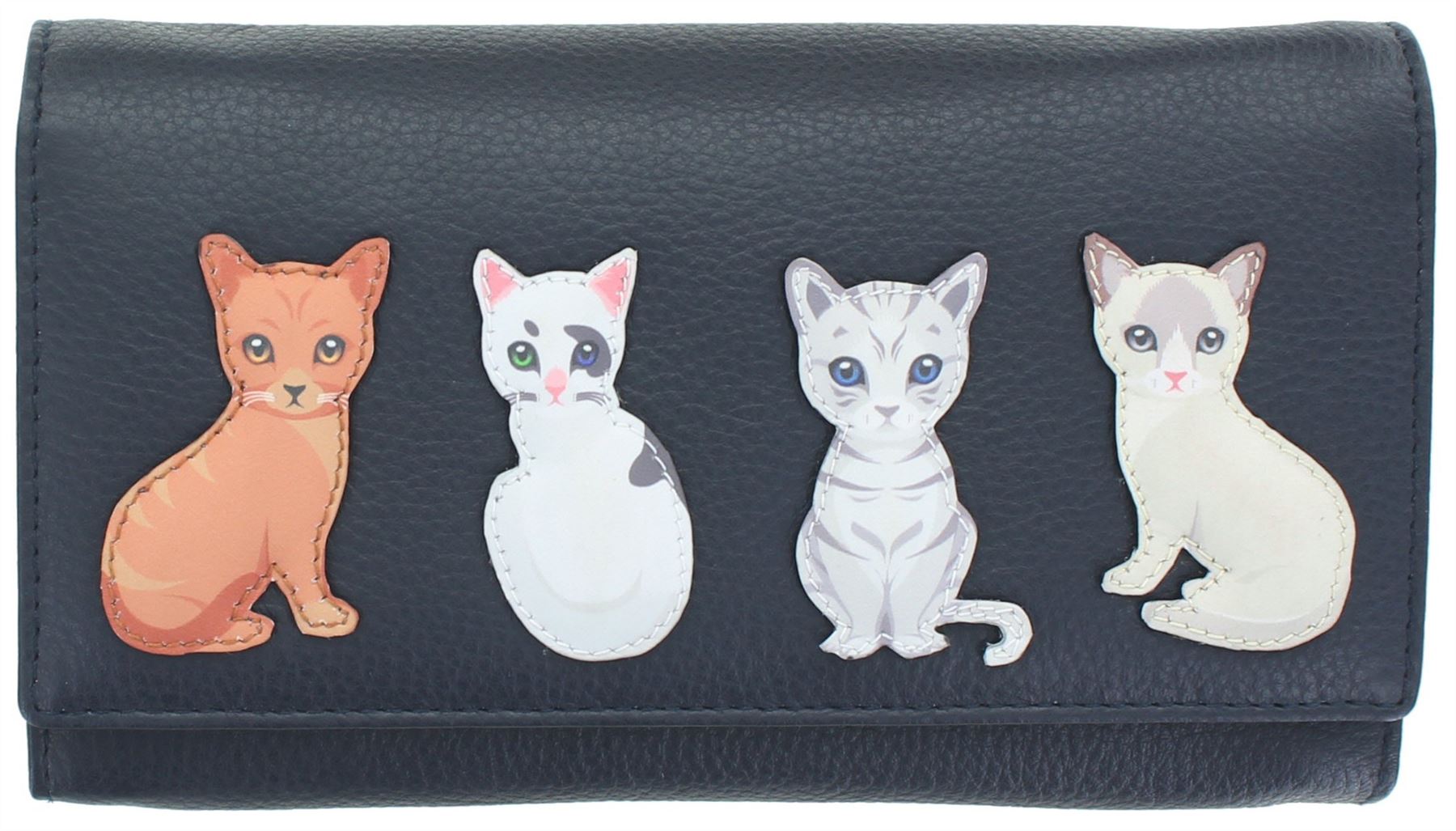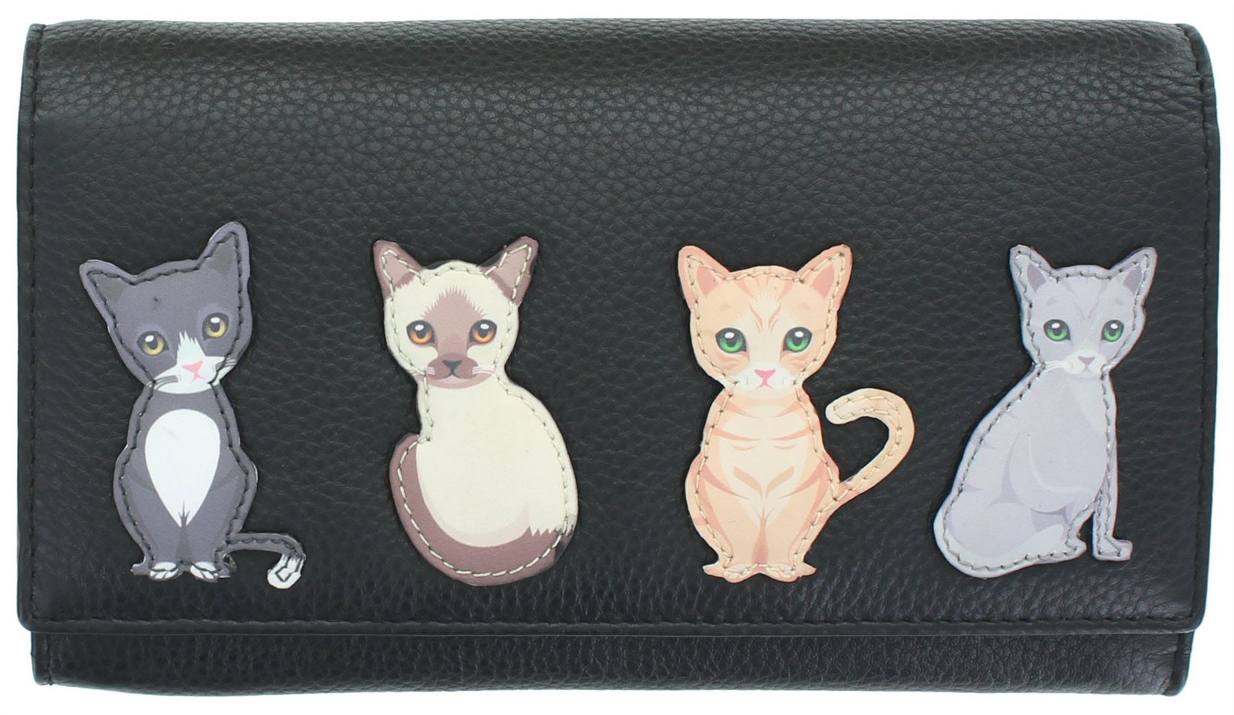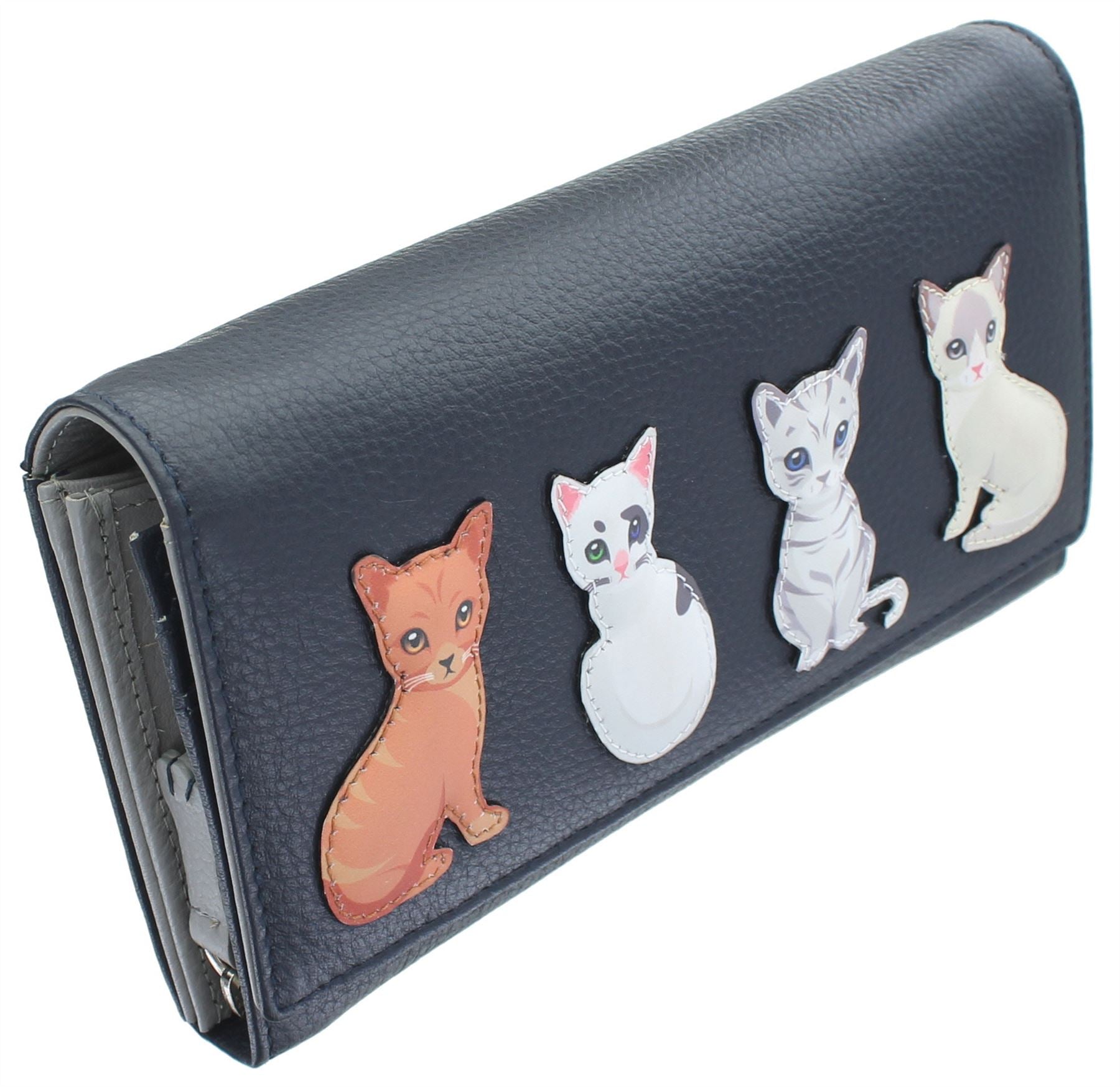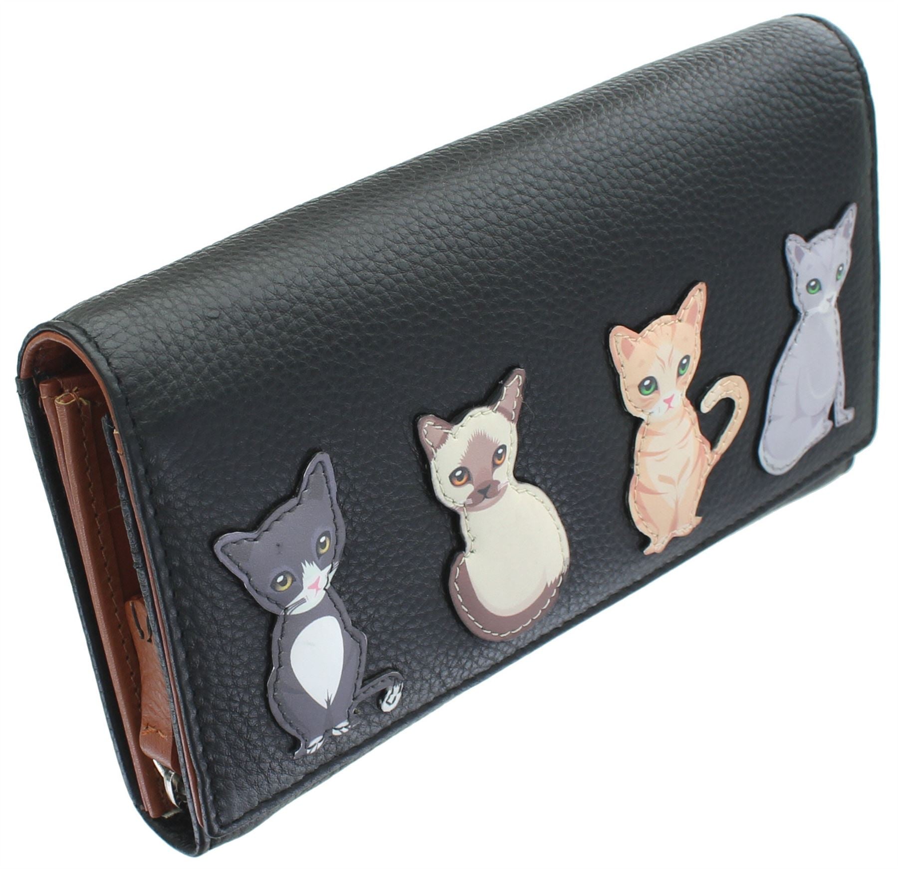 Soft supple leather ladies flap over purse with applique 'sitting cats' detail 17cm x 10cm x 3cm