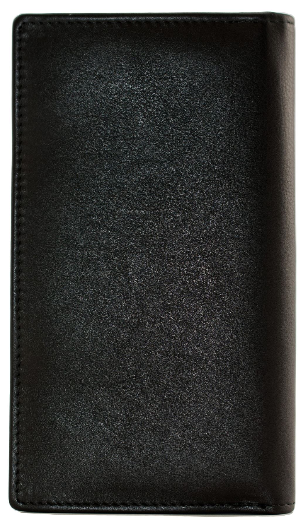 11 card slots, 4 slip pockets, I/D photograph window and a single deep pocket for banknotes. All secured by a leather tab with dual position press stud fastening