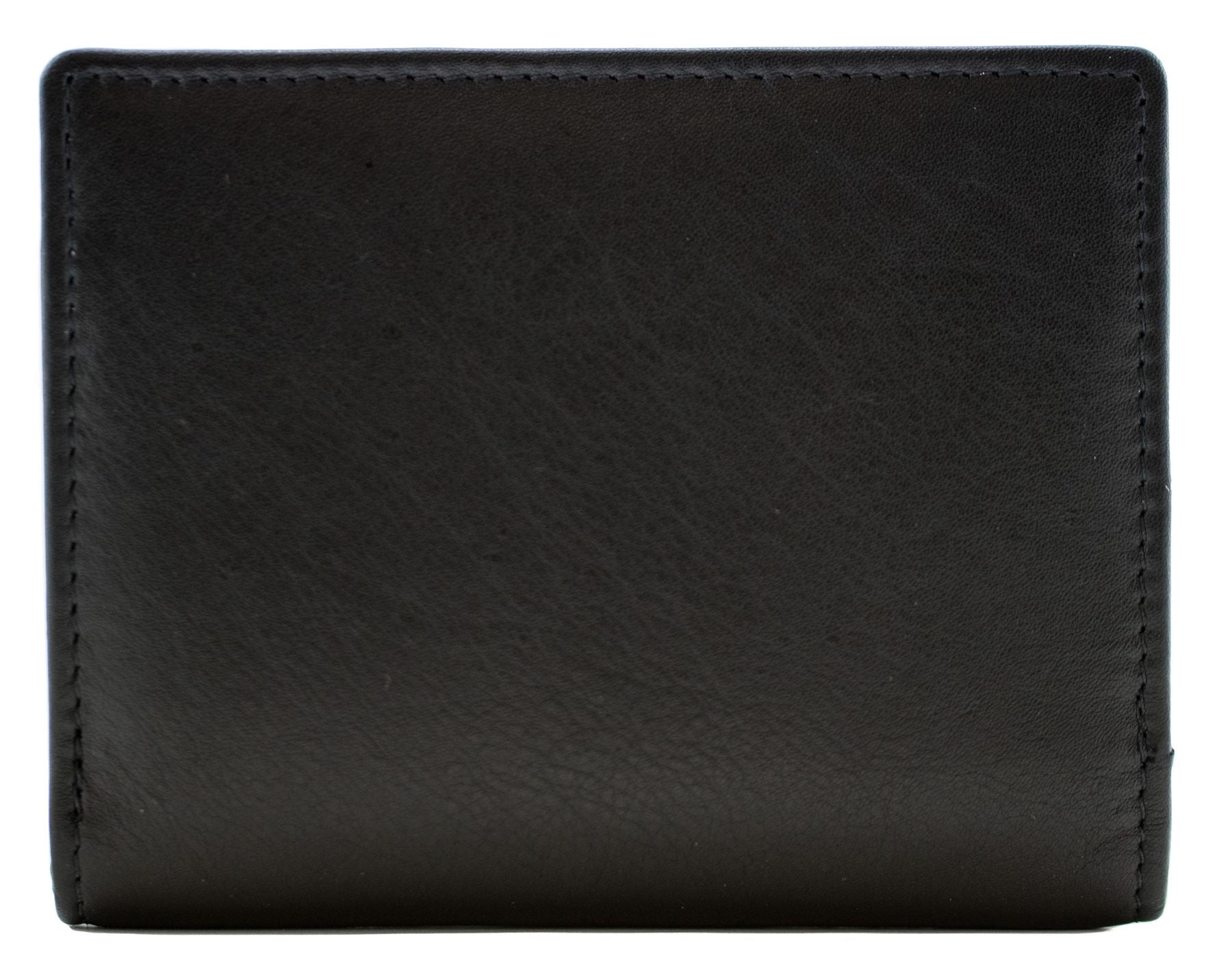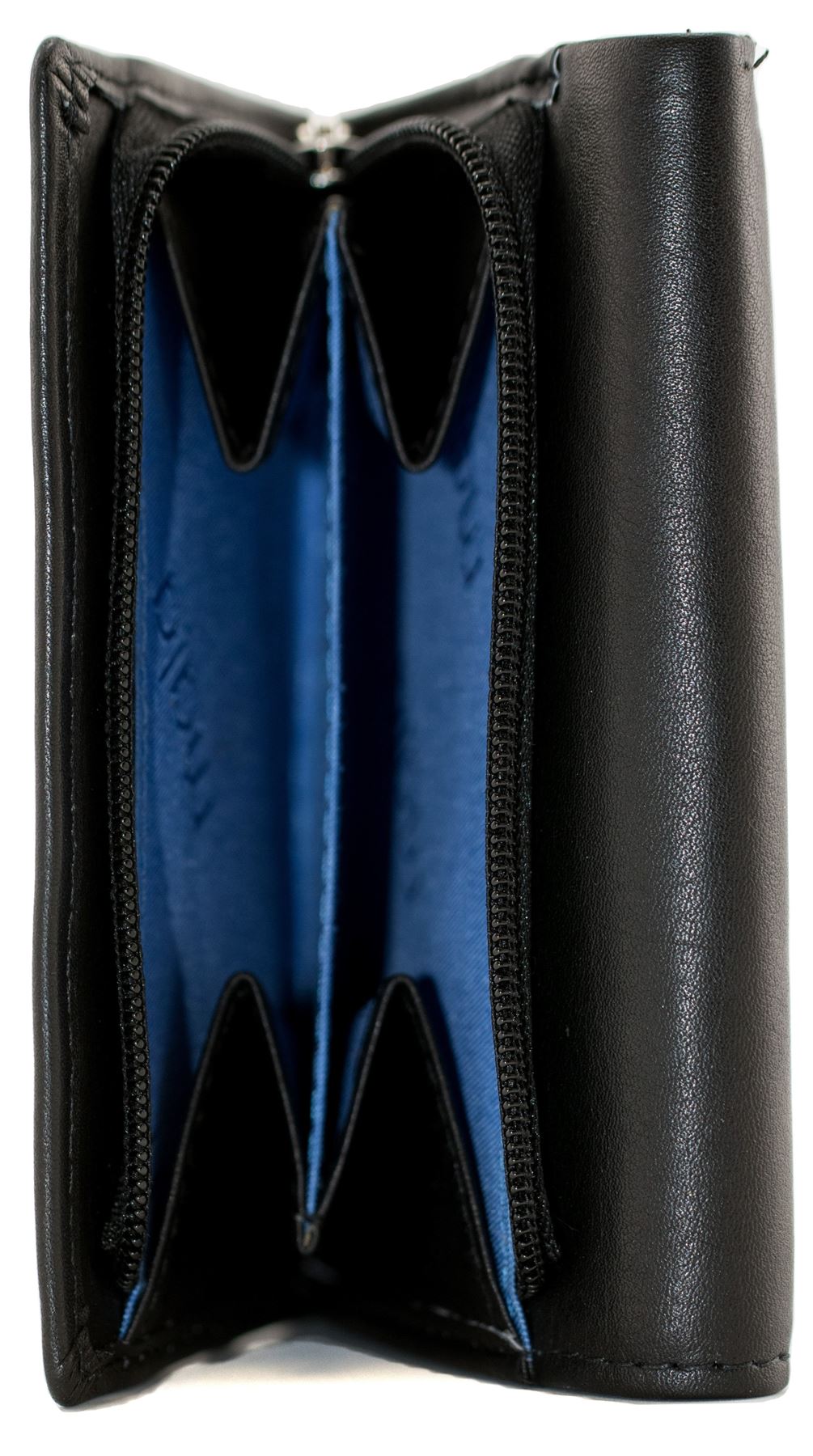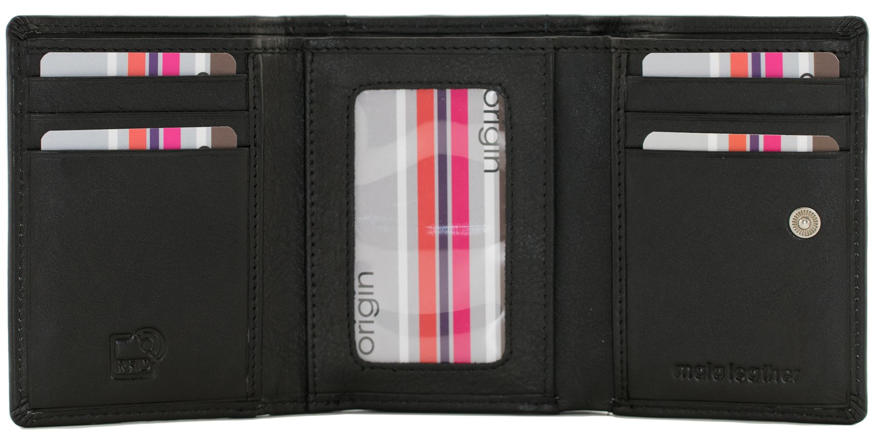 6 card slots, 2 slip pockets for extra cards, receipts etc. I/D photograph window and a single banknote section. All secured with a press stud fastener. Zipped coin section with central divider.
