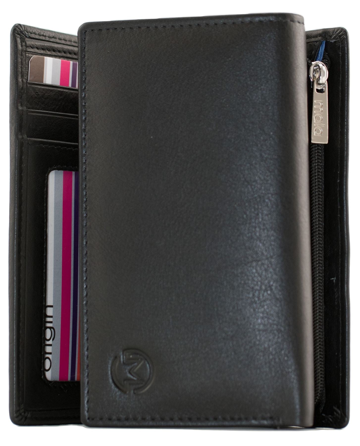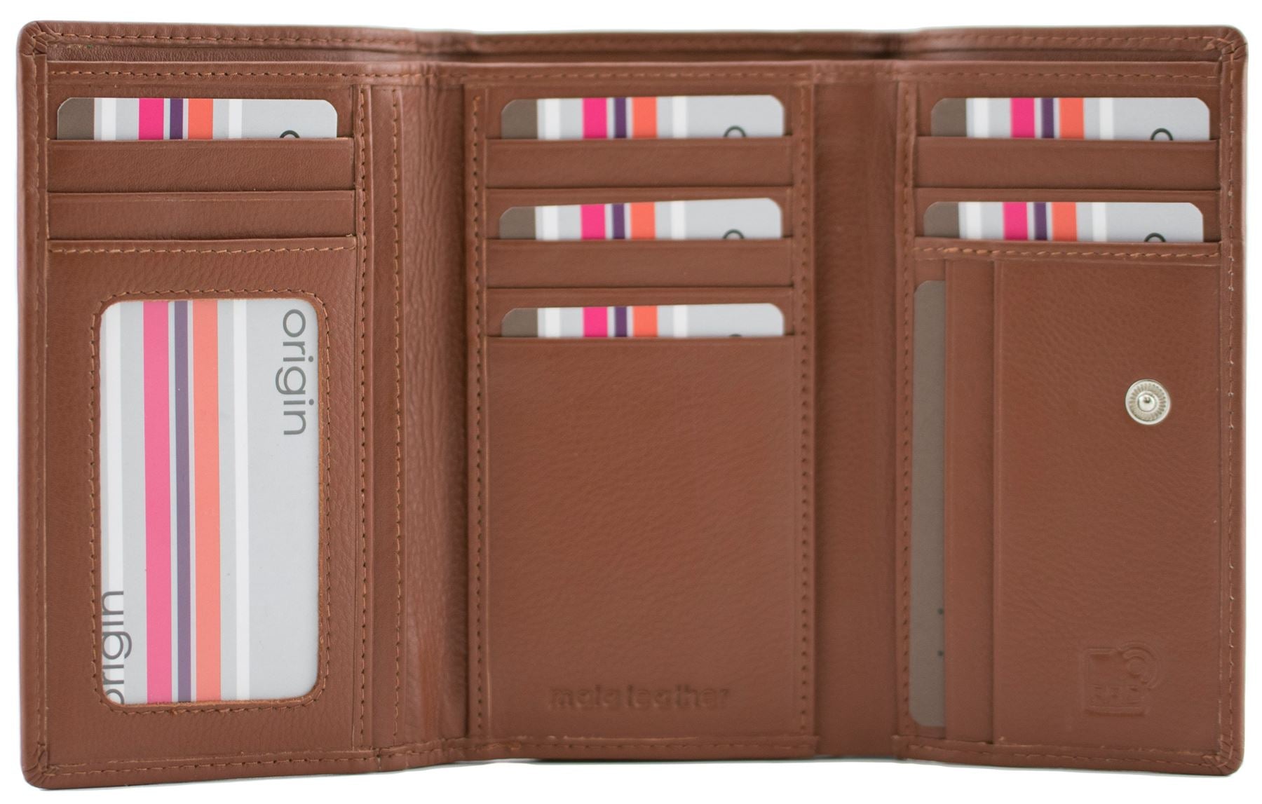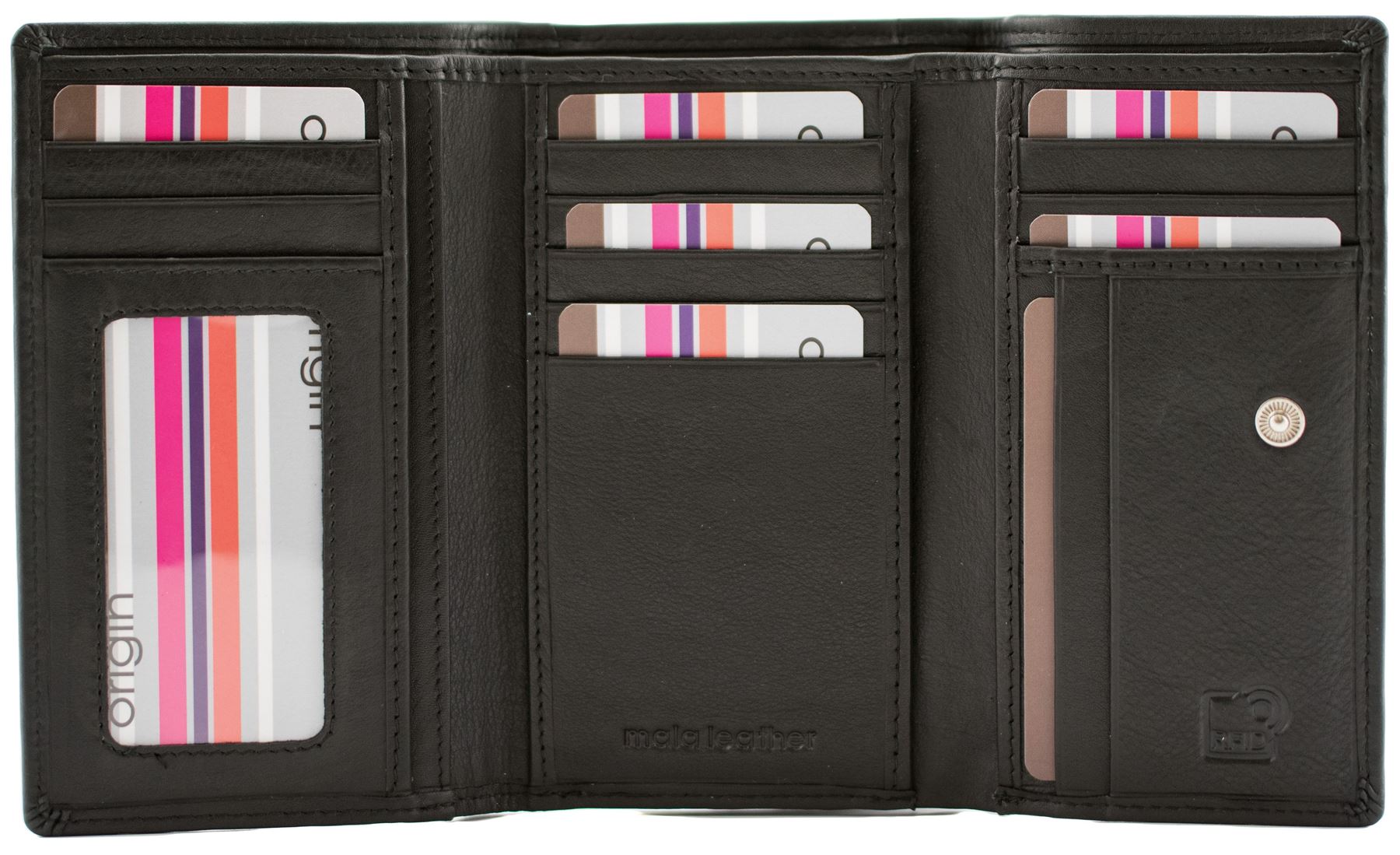 12 card slots, 4 slip pockets for extra cards, receipts etc. I/D photograph window and a single banknote section. All secured with a dual position press stud fastener. Zipped coin section with central divider.