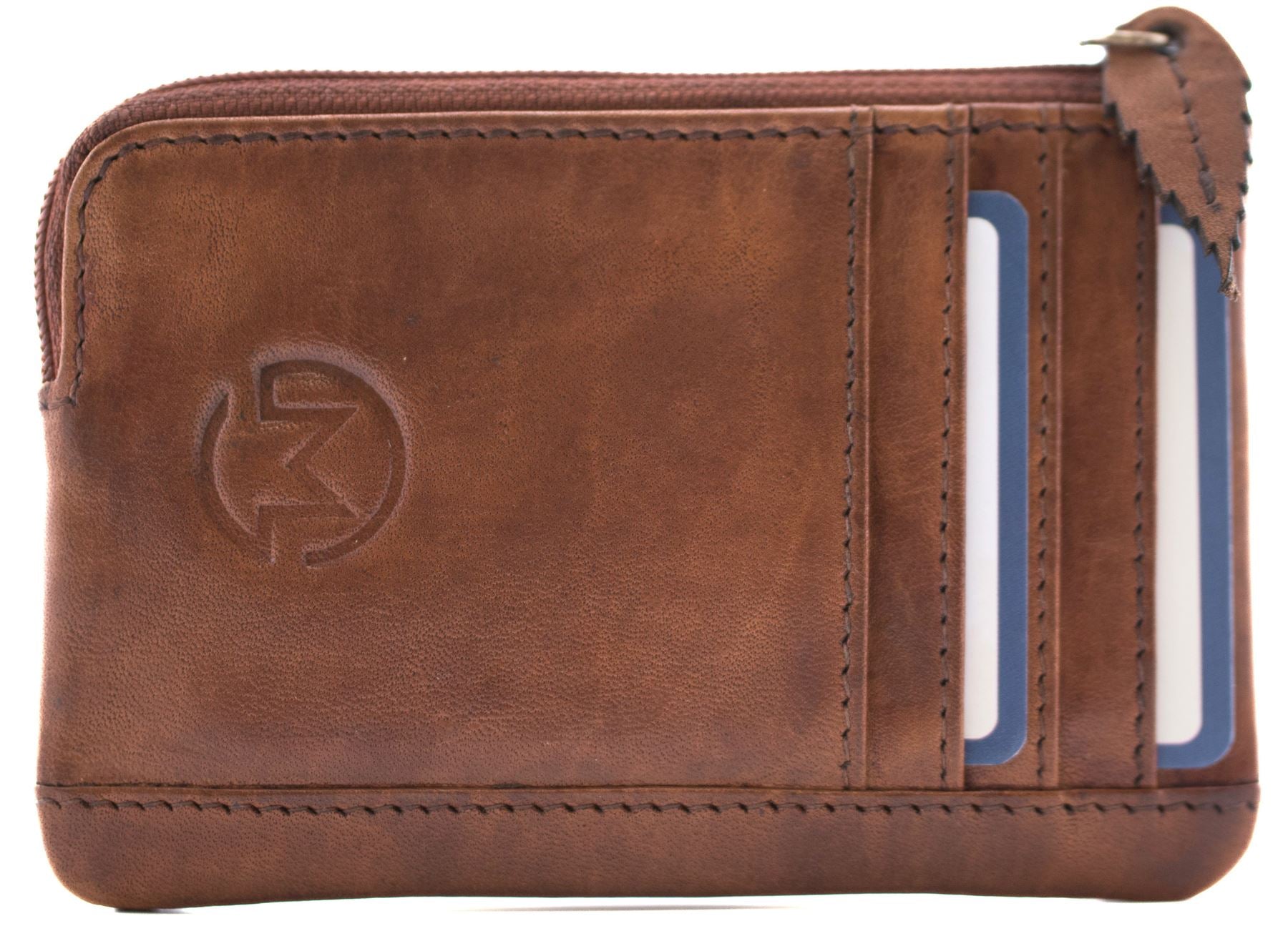 Zipped top opening - this section has a keychain which can be removed. Leaf shaped zip puller. 4 outer credit card slots.