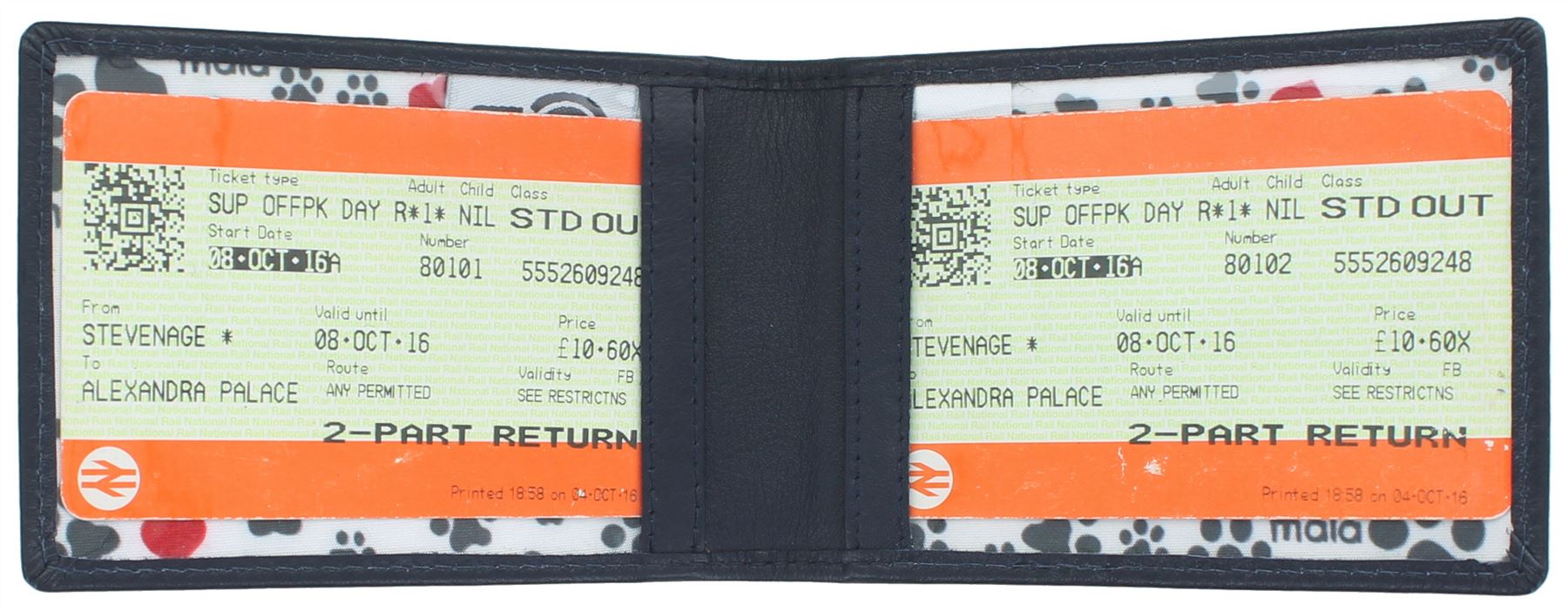 Interior has 2 clear plastic panels making photo cards and travel tickets easily visible